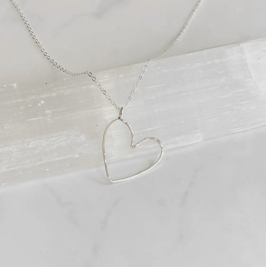 a beautiful heart necklace makes the perfect gift to show someone or yourself some love. A hand forged from 14K gold filledwith a dappled texture to catch the light. the heart dangles at a sideways angle on the 14K gold filled chain.