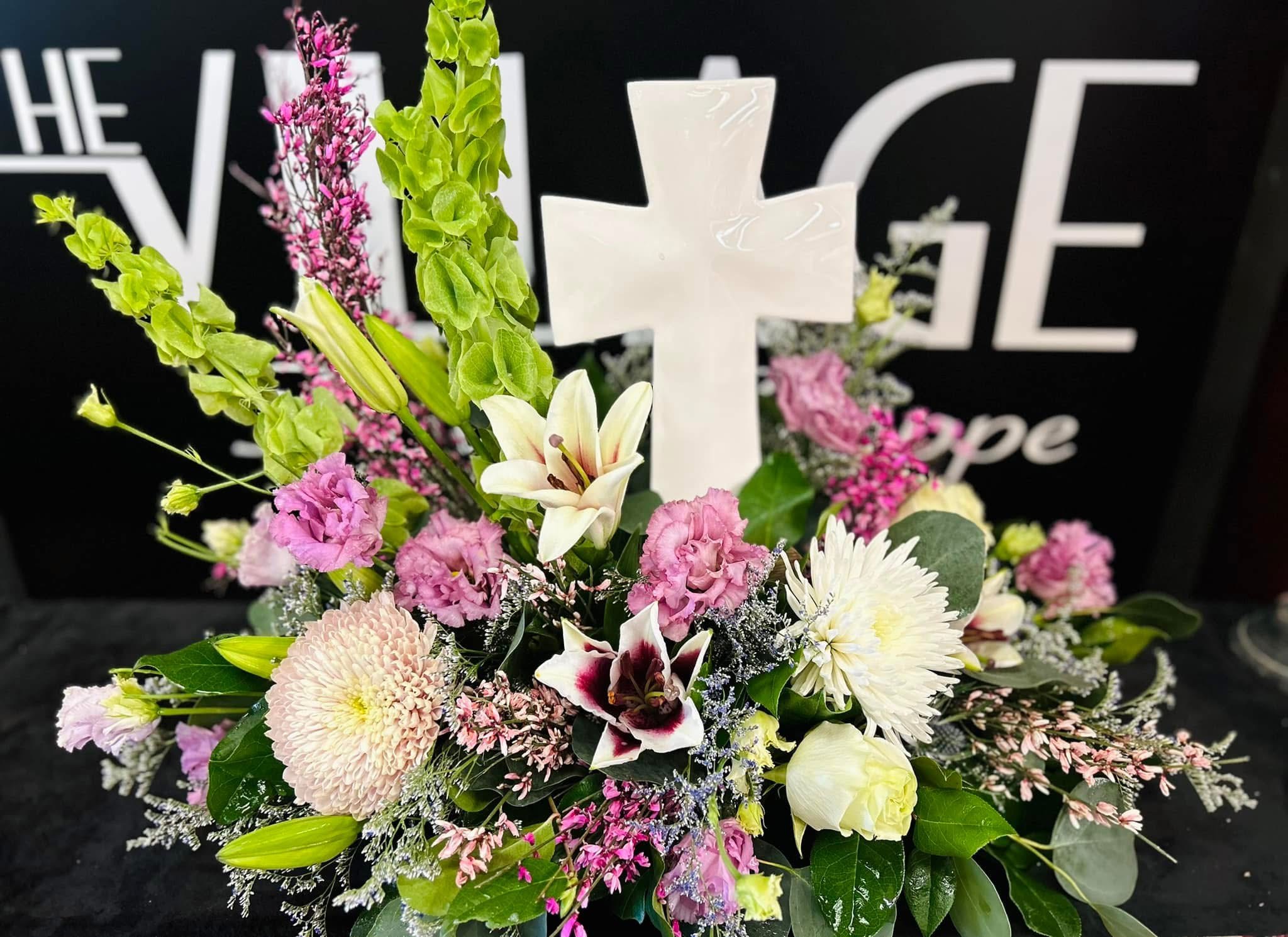 Send the very best when you send a floral mix with a keepsake cross surrounded in the freshest, most uplifting flowers of the season.