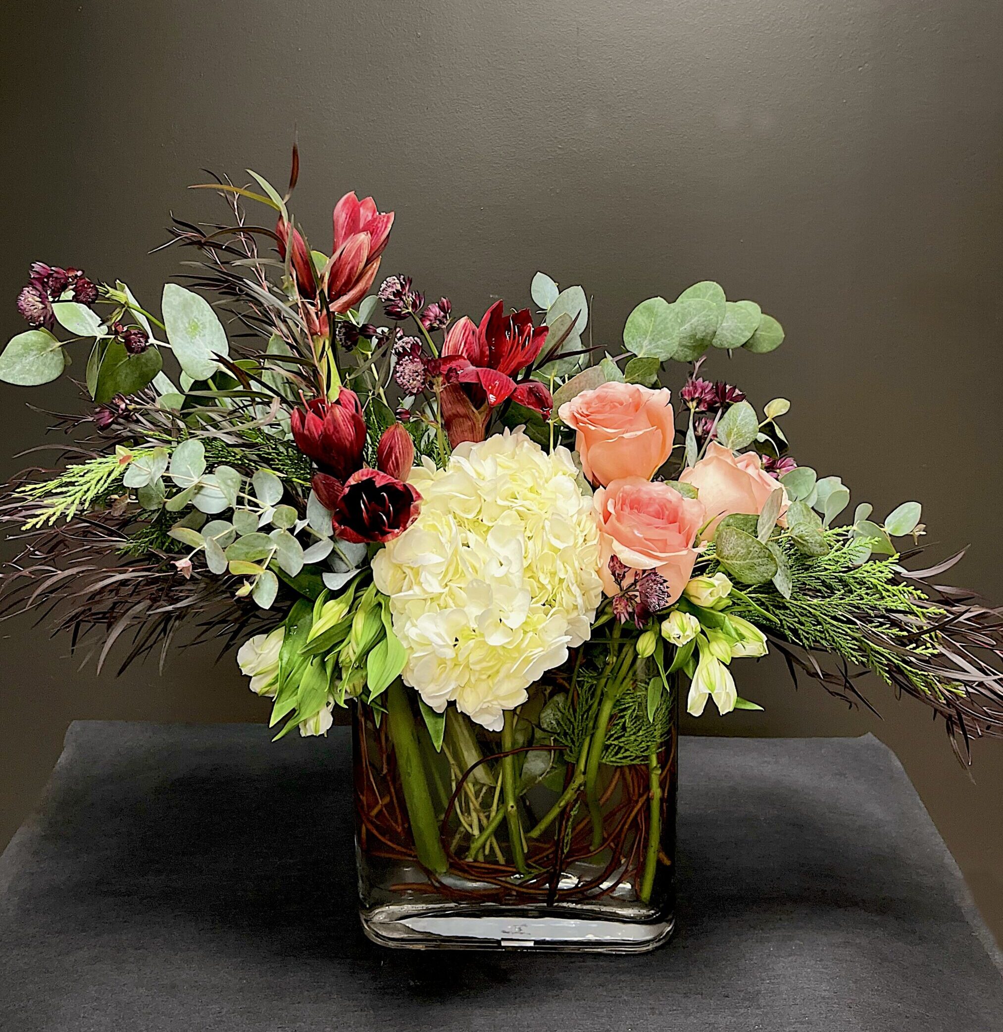 Riverpoint Rendezvous – Fun, Flirty and still luxe. Your cue to show off a little with an arrangement that brings the boldest blooms of the season-pops of color and lush greens-styled like they’re ready for a night out downtown! It’s giving festive, it’s giving local flair and it’s absolutely giving “look at me” vibes.