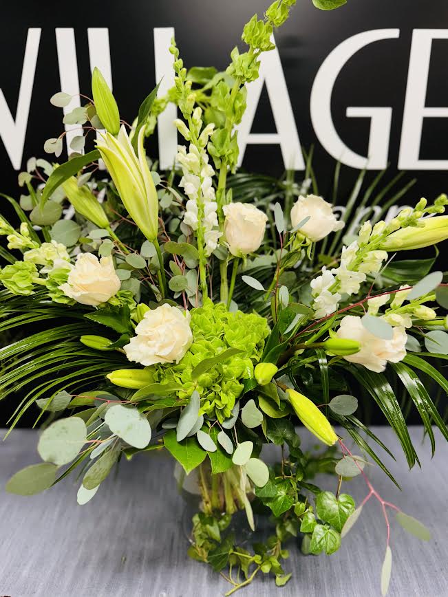 A beautiful classic arrangement of white blooms in a mix of greens. You can never go wrong with traditional mix of flowers.