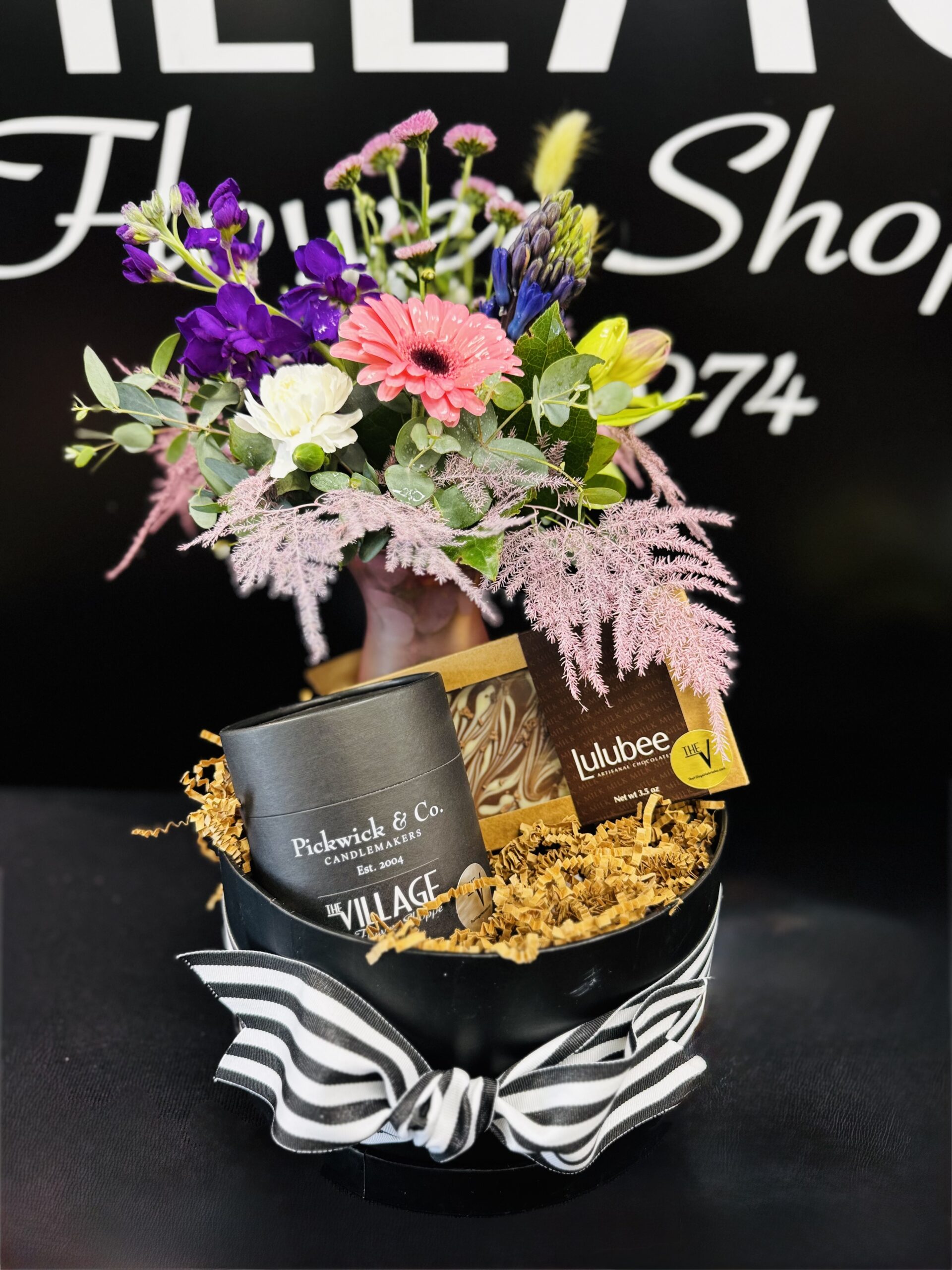 A beautifully curated trio of joy – fresh blossoms, a cozy Pickwich & Co signature scent Village candle & a decadent gourmet handmade in Lincoln NE chocolate Lulubee bar. Designed to delight the senses and warm the heart. The perfect little luxury for celebrating, gifting or simply brightening someone’s day.