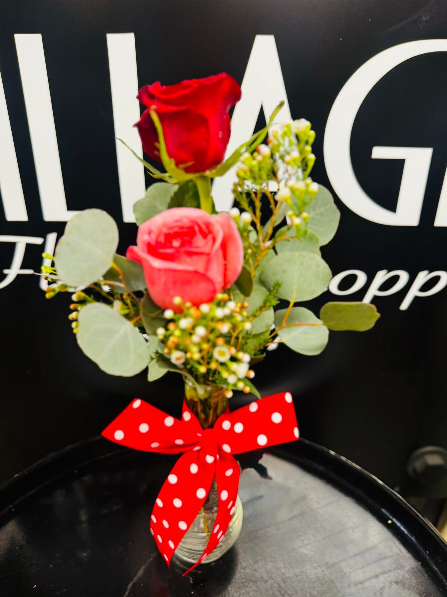 Double the charm, double the flirt. two perfectly pretty roses styled just right in a sweet little bud vase-because sometimes less is more and two is irresistible. perfect for crushing, blushing or casually saying “I thought of you”